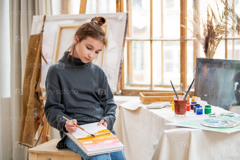 Девушка рисует картину на холсте. На ней фартук, в руке у нее кисть. Картина красочная и живая, с сочетанием зеленых и синих оттенков