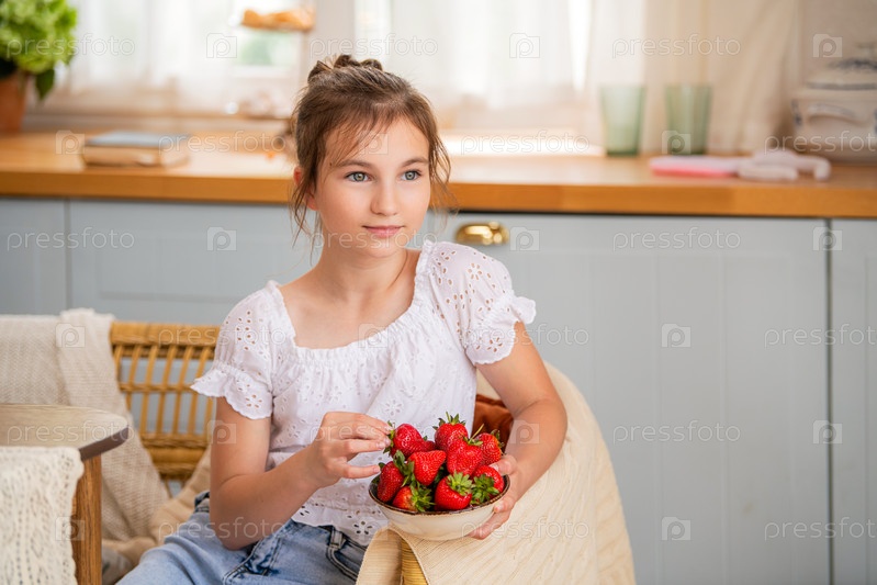 Молодая девушка ест спелую клубнику в интерьере загородного дома на кухне. Концепция фруктового счастья и удовольствия