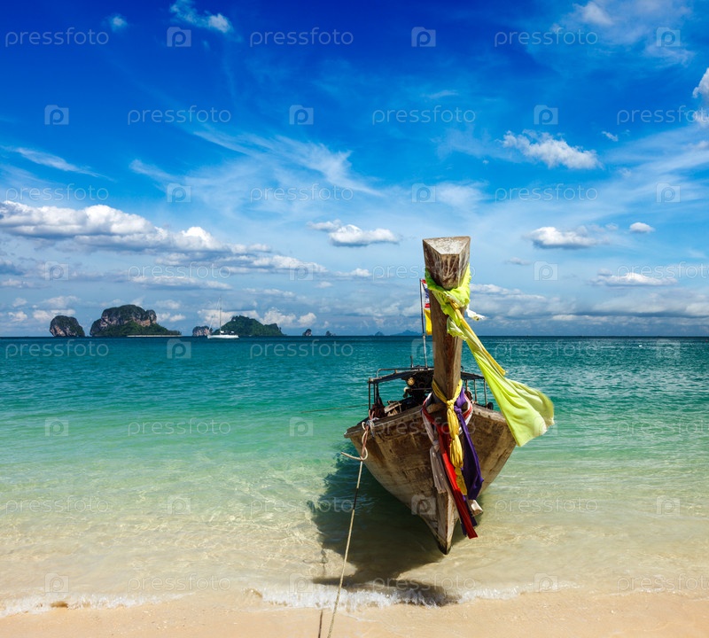 Лодка с длинным хвостом на пляже, Таиланд