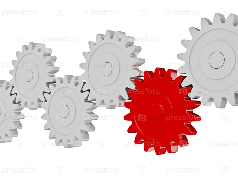Концепция партнерства, сотрудничества и лидерства в командной работе: зубчатые колеса подряд работают вместе, изолированные на белом