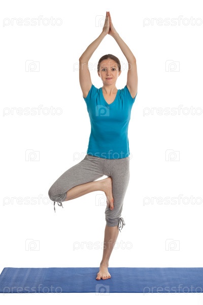 Йога - молодая красивая женщина-инструктор йоги, выполняющая упражнения в позе дерева (Врикшасана) на белом фоне