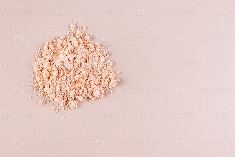 Куча сыпучего светлого порошка на бежевом фоне. место для текста. макет вашего продукта. Концепция текстуры цветной косметики. Вид сверху