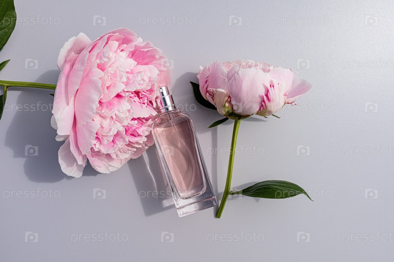 Элегантный флакон розовых духов на сером фоне среди шикарных пионов. нежный натуральный цветочный аромат. презентация продукта. вид сверху