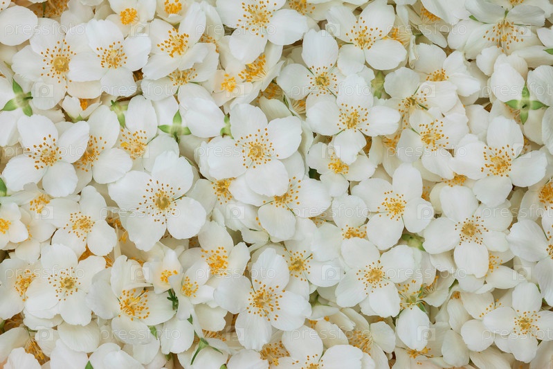 Цветы белого жасмина по всему кадру. Ингредиент для жасминового чая