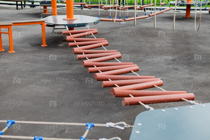 Детская площадка с современной горкой, веревочным мостом, качелями, альпинистами. Пустая деревянная площадка из экологически чистых материалов