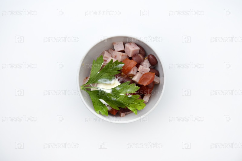 Овощной салат с мясом и соусом в белом салатнике. Небольшой перекус