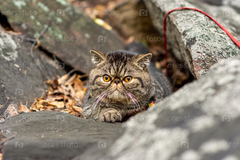Симпатичная коричневая полосатая экзотическая короткошерстная порода кошек, сидящая на сером камне, боится путешествовать на свежем воздухе и с испугом оглядывается по сторонам