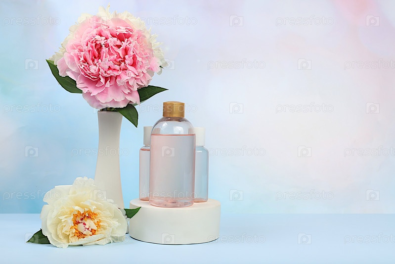 Спа и оздоровительная композиция с цветами пиона и розовым лосьоном на элегантном фоне, органическая косметика и концепция естественного ухода за кожей, реклама магазина, избирательный фокус