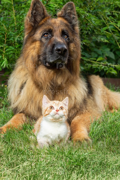 Рыжий кот и немецкая овчарка вместе лежат на траве