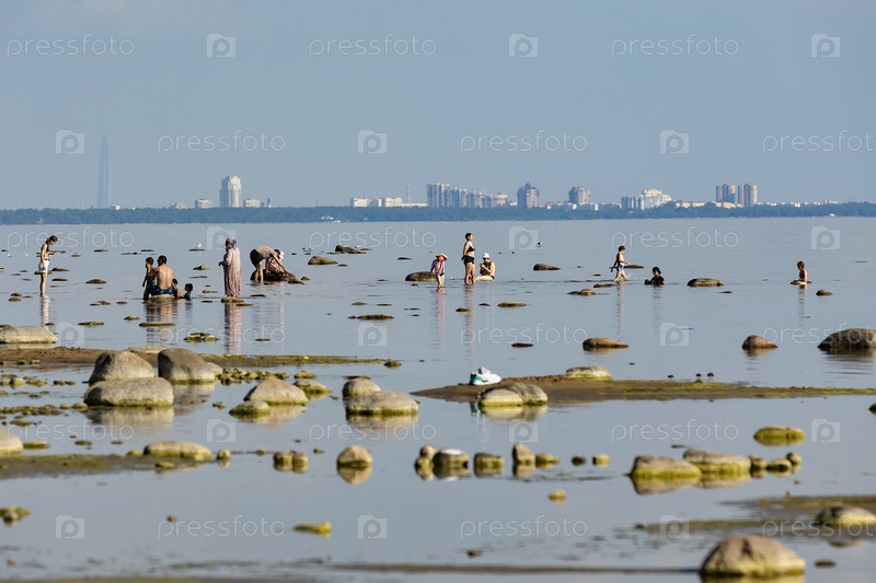 Россия. Санкт-Петербург. Горожане отдыхают на берегу узкого Финского залива. Россия. Санкт-Петербург. Жители города расслабляются на берегу мелкого Финского залива