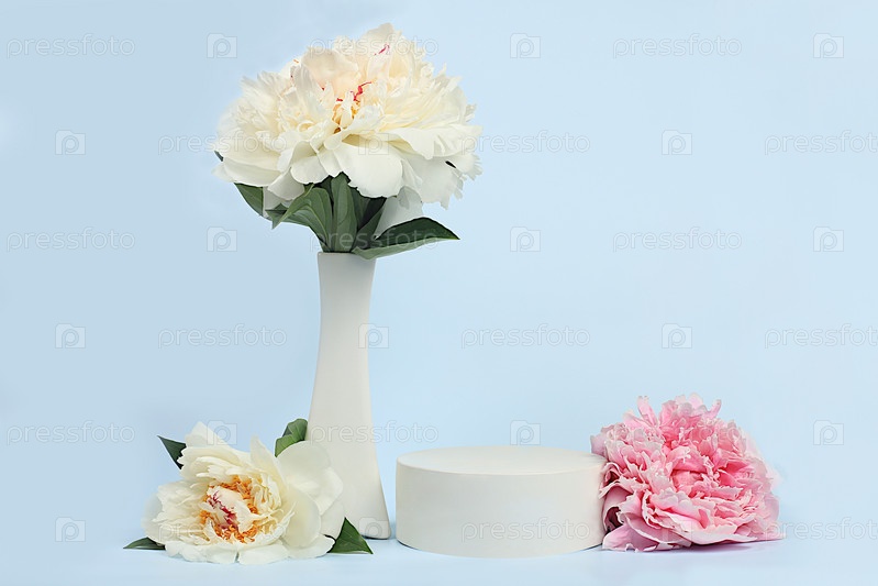 Абстрактный фон с пустым подиумом и цветами пионов, пустая витрина для демонстрации или презентации косметических продуктов, минимальная цветочная композиция с местом для текста,
