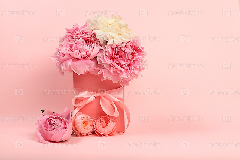 Абстрактная цветочная композиция из красивых свежих цветов пиона в подарочной коробке. Минимальная современная эстетика. элегантная концепция красоты, реклама на экране, баннер,
