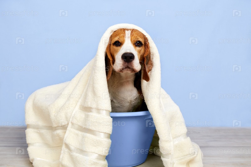 В тазике сидит мокрая собака породы бигль в белом полотенце