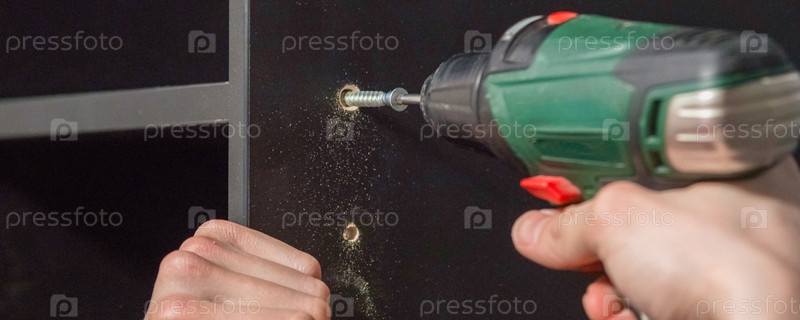 Профессиональная сборка мебели с помощью специального инструмента, крупный план, размытый фон