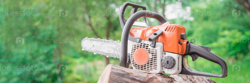Бензопила лежит на распиленных бревнах среди зелени леса, выборочный фокус размыт фон