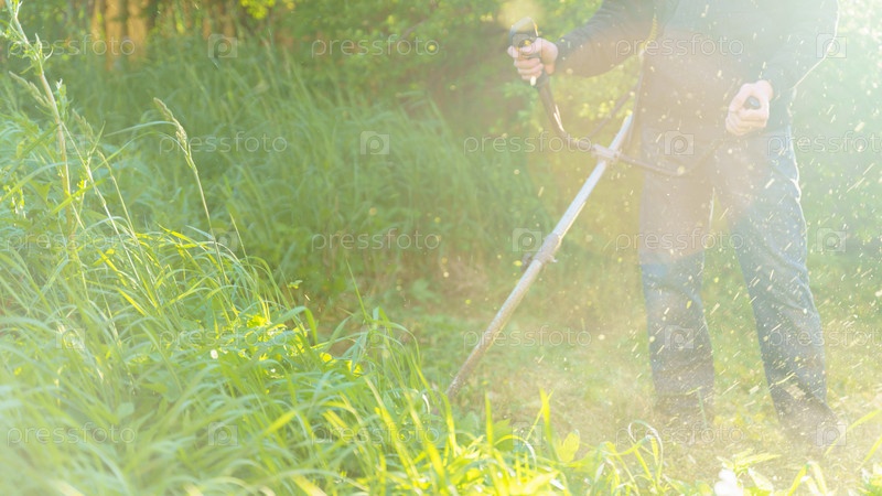 Мужчина косит траву триммером, фокусируется на размытом фоне переднего плана