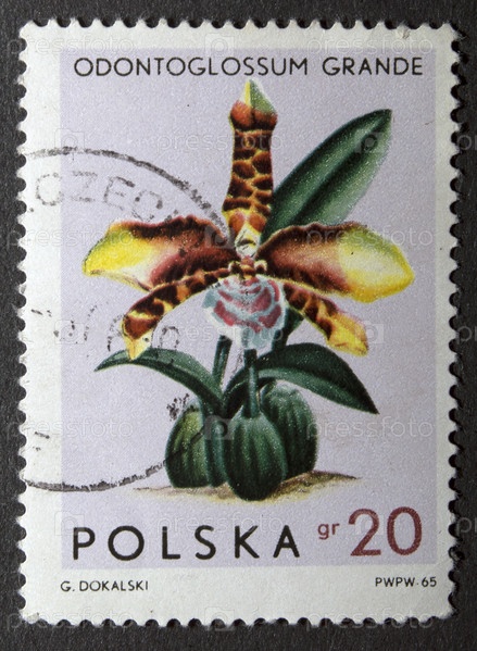 Почтовая марка Польши 1965 года. Россиоглоссум большой (Odontoglossum grande или Rossioglossum grande). Орхидея. Почтовая марка с выключением