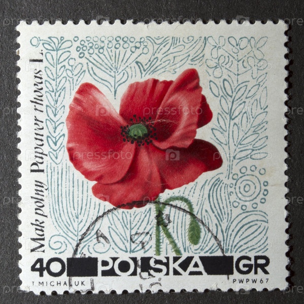 Почтовая марка Польши 1967 года, обыкновенный мак (Papaver rhoeas L.)