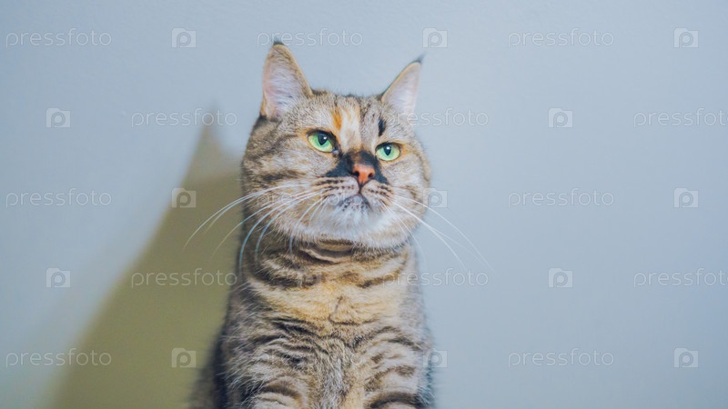 Кот забрался на очень высокое место и выглядит очень довольным, вид снизу