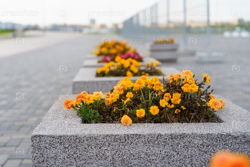 Желтые цветы на клумбах на тротуаре в городе
