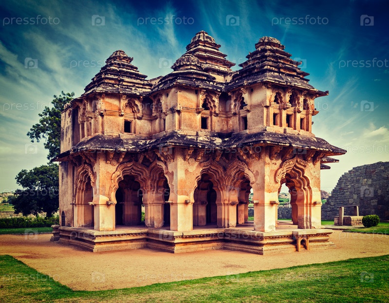 Винтажный ретро-эффект отфильтровал туристическое изображение руин дворца Лотос-Махал в стиле хипстеров. Королевский центр. Хампи, Карнатака, Индия