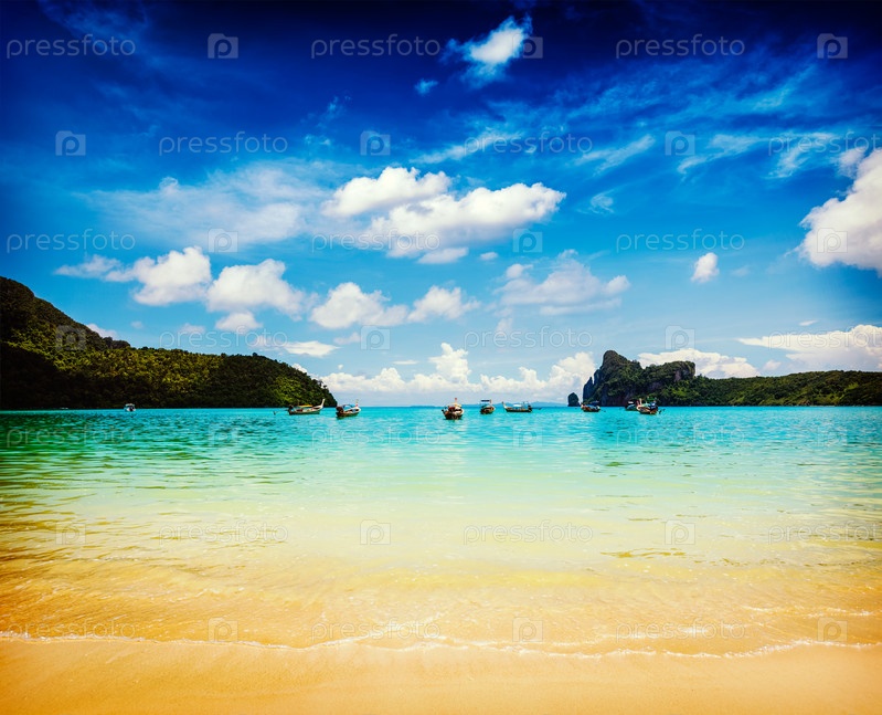 Винтажный ретро-эффект отфильтровал образ путешествия в стиле хипстеров с длинными хвостовыми лодками в заливе. Остров Пхи-Пхи, Краби, Таиланд