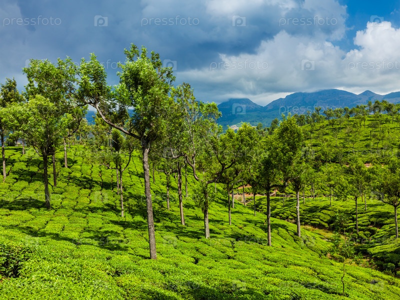 Керала, Индия, путешествие - плантации зеленого чая с деревьями в Муннаре, Керала, Индия, крупным планом