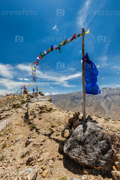 Буддийские молитвенные флаги Лунгта в долине Спити. Дханкар, долина Спити, Химачал-Прадеш, Индия