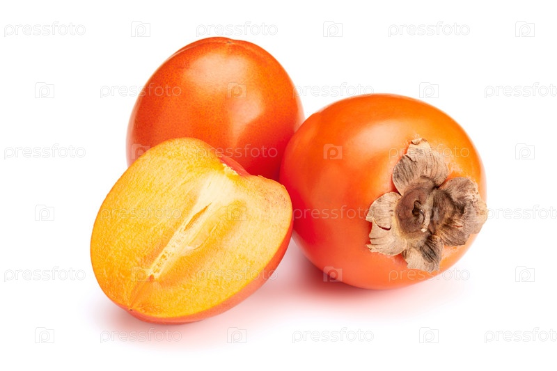 Свежая спелая оранжевая хурма и ломтик изолированы на белом фоне