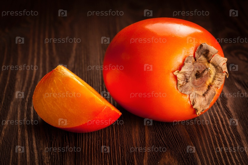 Свежая спелая оранжевая хурма и ломтик на деревянном фоне