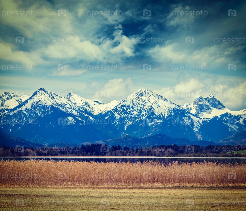 Винтажное ретро-хипстерское туристическое изображение ландшафта озера в сельской местности Баварских Альп. Бавария, Германия
