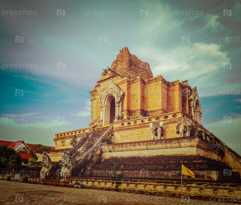 Винтажное ретро-хипстерское туристическое изображение буддийского храма Ват Чеди Луанг. Чиангмай, Таиланд