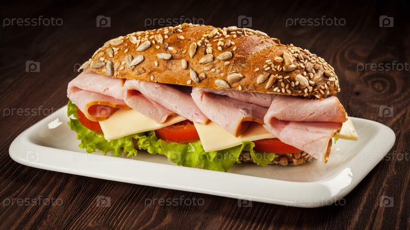 Панорама сэндвича с ветчиной, салатом, сыром и помидорами на тарелке на деревянном столе