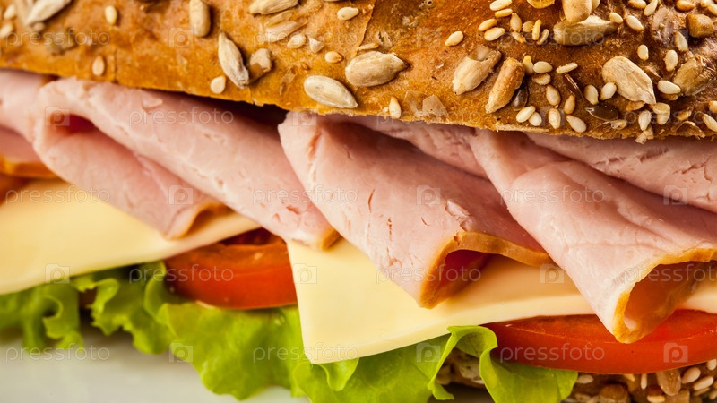 Панорама сэндвича с ветчиной, салатом, сыром и помидорами крупным планом