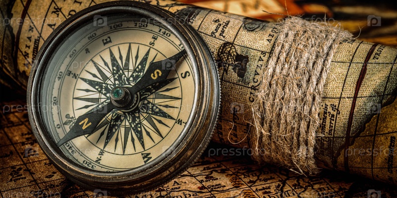 Фон концепции навигации по географии путешествий - панорама почтового ящика старого винтажного ретро-компаса на карте древнего мира
