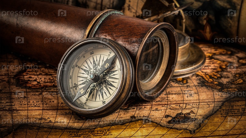 Старый винтажный компас на древней карте