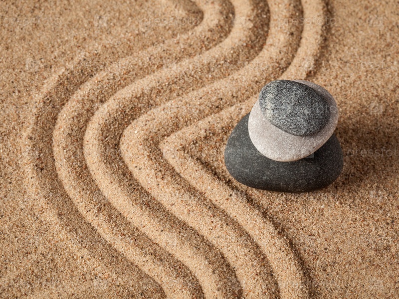 Японский каменный сад дзен - концепция релаксации, медитации, простоты и баланса - галька и грабленный песок спокойная спокойная сцена