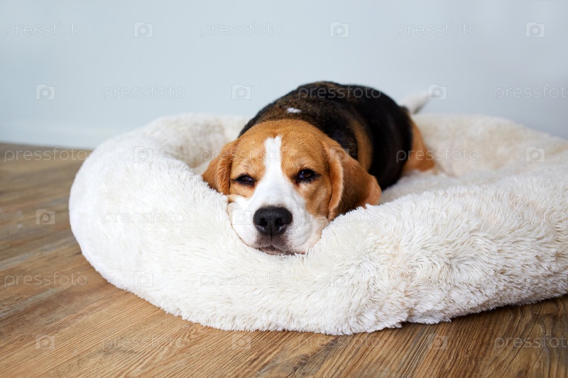 Собака бигль лежит на собачьей подстилке