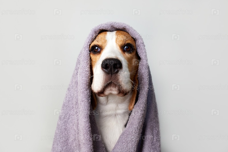 Собака-бигль в сером полотенце после купания