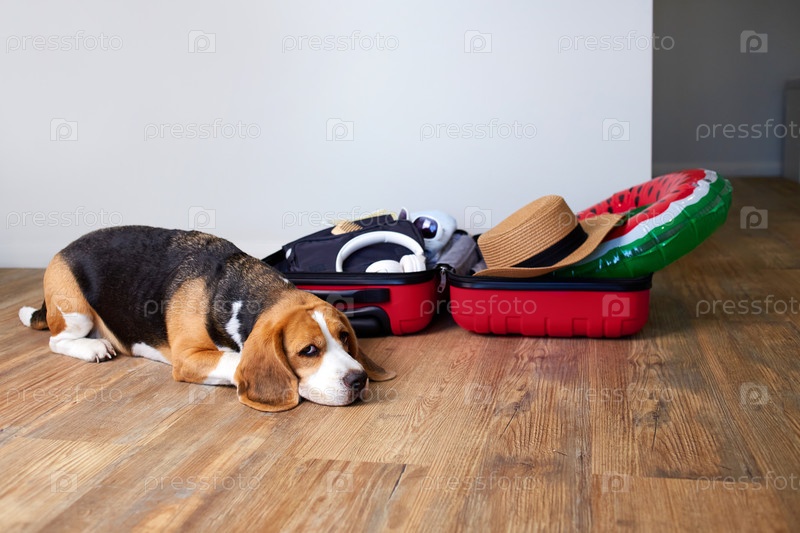 Собака-бигль лежит на полу у чемодана с вещами и аксессуарами для летних каникул