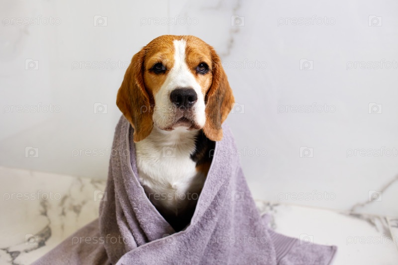 Собака-бигль в сером полотенце после купания