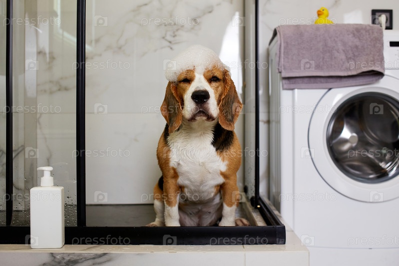 Мокрая собака с пеной шампуня на голове в душевой кабине. Интерьер современной ванной комнаты