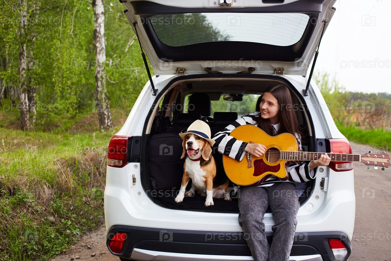 Маленькая девочка и собака породы бигль сидят в багажнике машины