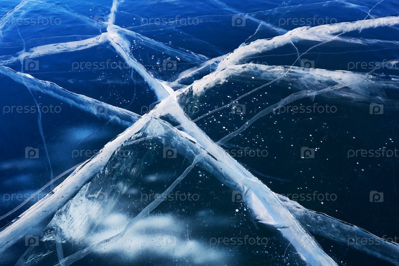 Прозрачный голубой лед с трещинами. Озеро Байкал зимой