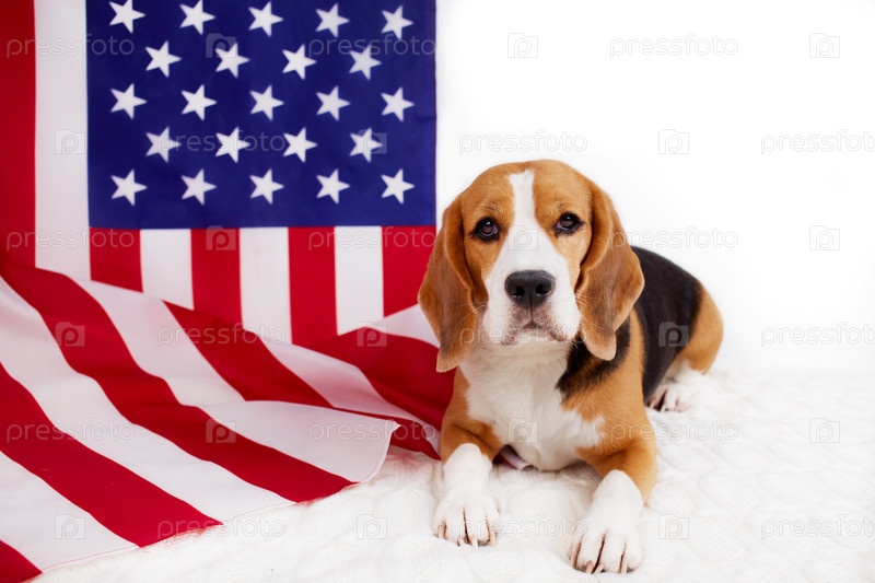 Милая собака-бигль лежит рядом с американским флагом