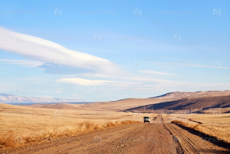 Пейзаж острова Ольхон. Российский внедорожник, типичный туристический автобус под названием Буханка