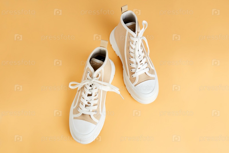 Пара бежевых кроссовок на изолированном оранжевом фоне. Беговая обувь