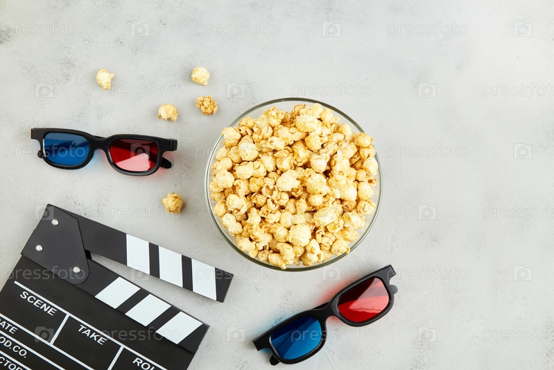 Миска с попкорном и 3D-очки для просмотра фильмов с друзьями