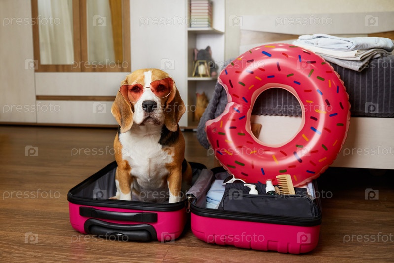 Собака-бигль у чемодана с вещами для летнего отдыха на море