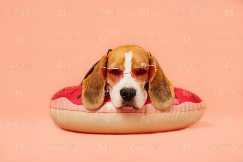 Милая собака-бигль в солнечных очках и плавательном кольце
